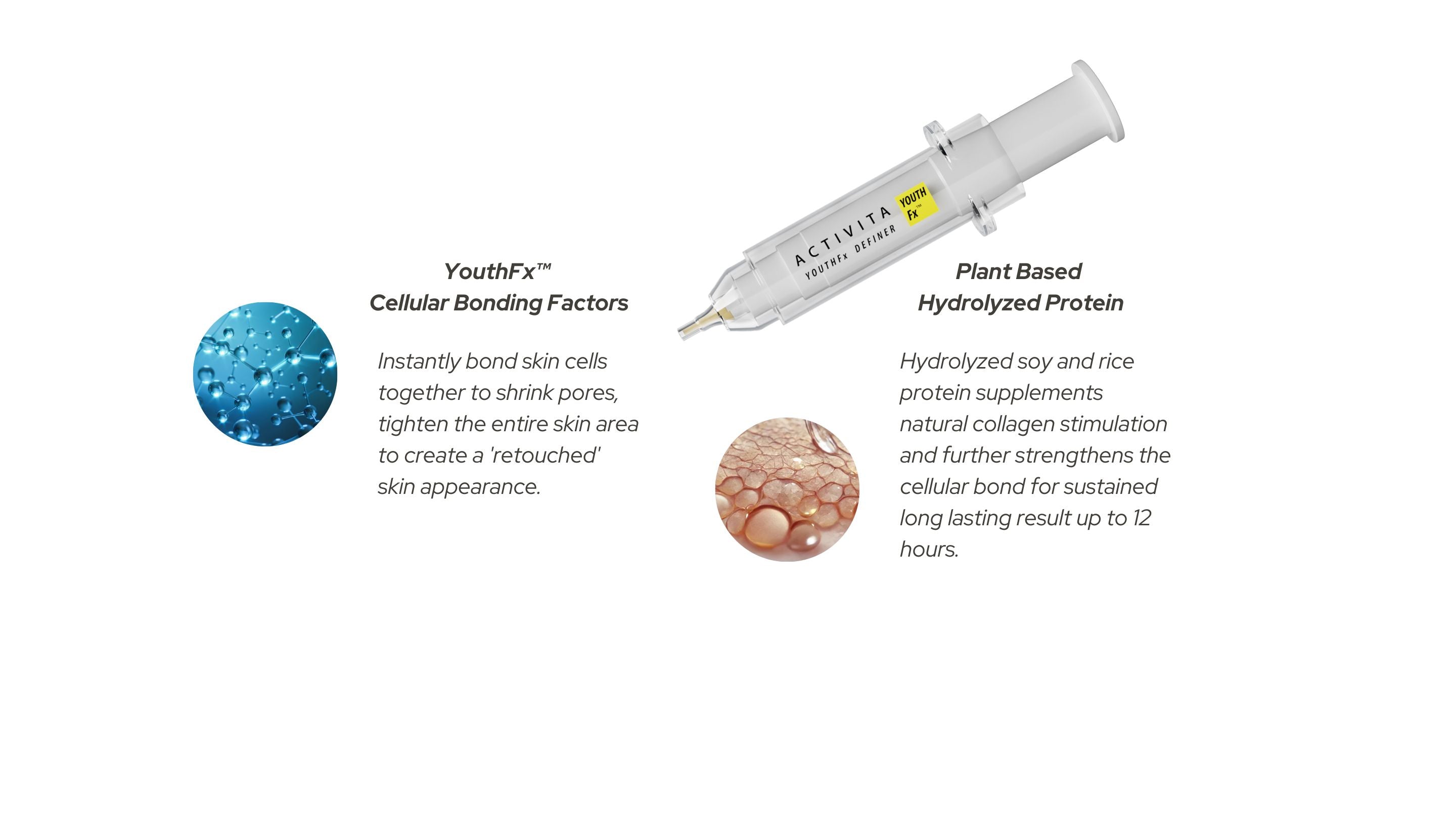 Aesthetic correction through multi-action YoutfhFx Cellular Bonding Factors to smooth the appearance & tighten the skin. Feel the tightening in 2 minutes.