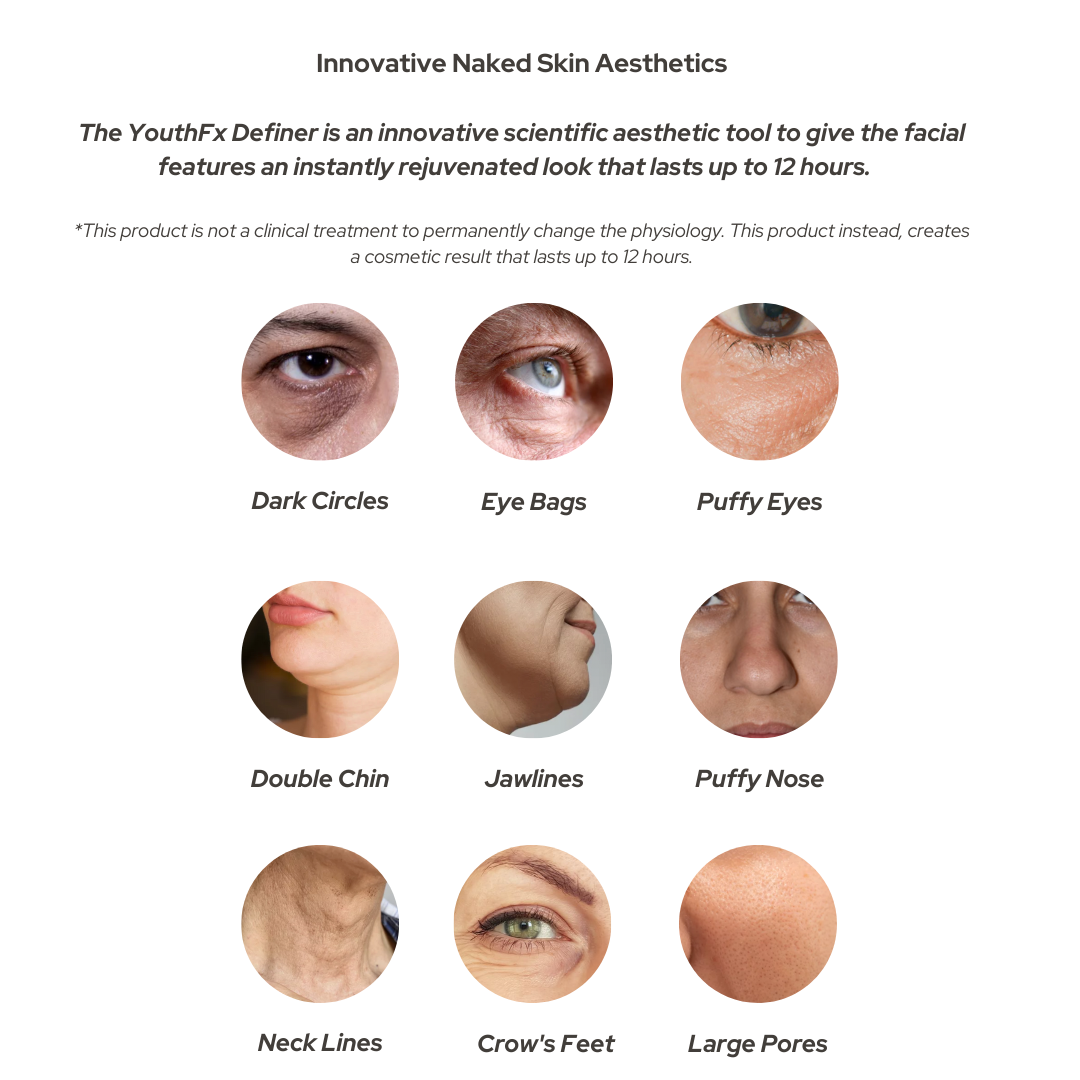It lasts up to 12 hours or until washed off. Similar to a makeup product, the YouthFx Definer is a topical aesthetic solution to instantly create an aesthetic appearance through bonding the skin cells together. It does not get absorbed by the skin and it can easily get washed off at the end of the day. It is ideal for events, dates and any occasion that requires a youthful appearance.