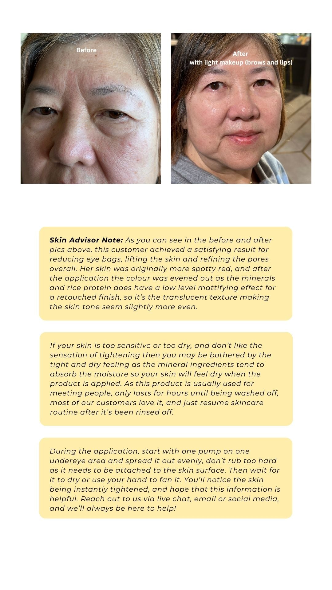Sustainable ingredients include Hydrolyzed Rice Protein & Magnesium derivatives stay on the skin's surface to instantly pull back creased saggy skin.