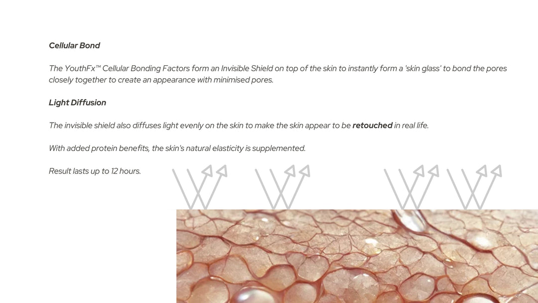 With a low refractory index, the YouthFx diffuses lighting sources naturally to create a smoothed skin effect that conceals large pores and uneven skin tone